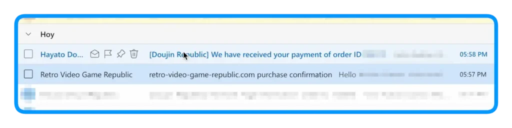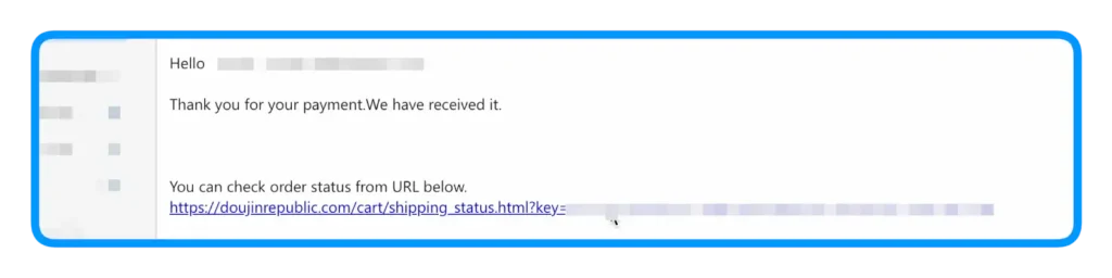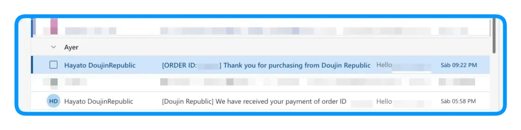 Una vez realizado el pago, recibirás casi de inmediato dos correos de confirmación, uno de Video Game Republic, y otro de Doujin Republic. En este último vendrá un enlace para dar seguimiento al pedido.