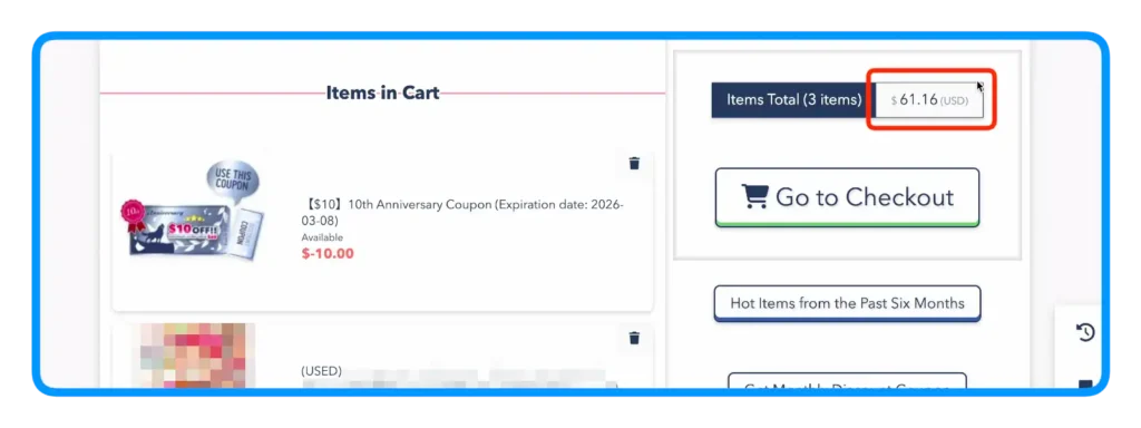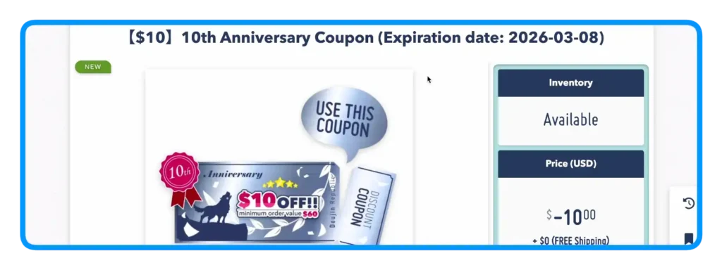 En cuanto a los cupones, Doujin Republic suele enviar descuentos por correo o publicarlos en su sitio durante ciertas promociones. Para utilizarlos no es necesario introducir ningún código: simplemente se agregan al carrito como si fueran un producto más y el descuento se aplica automáticamente al total del pedido.