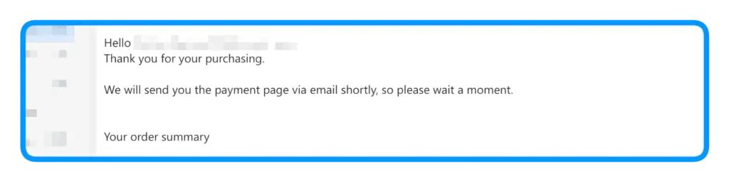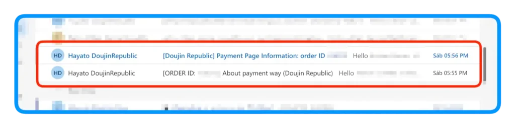 Después de confirmar, recibirás un primer correo donde Doujin Republic confirma tu orden y te indica que en breve recibirás otro mensaje con la página web para realizar el pago.